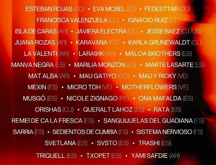 El primer avance del cartel confirma la presencia de Arroba Nat (MX), con letras cargadas de sensibilidad y verdad; Delaporte (ES), referentes de la electrónica y el pop alternativo; Esteban Rojas (CO), uno de los motores del movimiento urbano de Cali; la chilena Javiera Electra (CL), con una puesta en escena teatral y potente; el guatemalteco Jesse Baez (GT), figura del R&B en español; y la argentina Juana Rozas (AR), que transita entre el pop, el R&B y la experimentación electrónica.